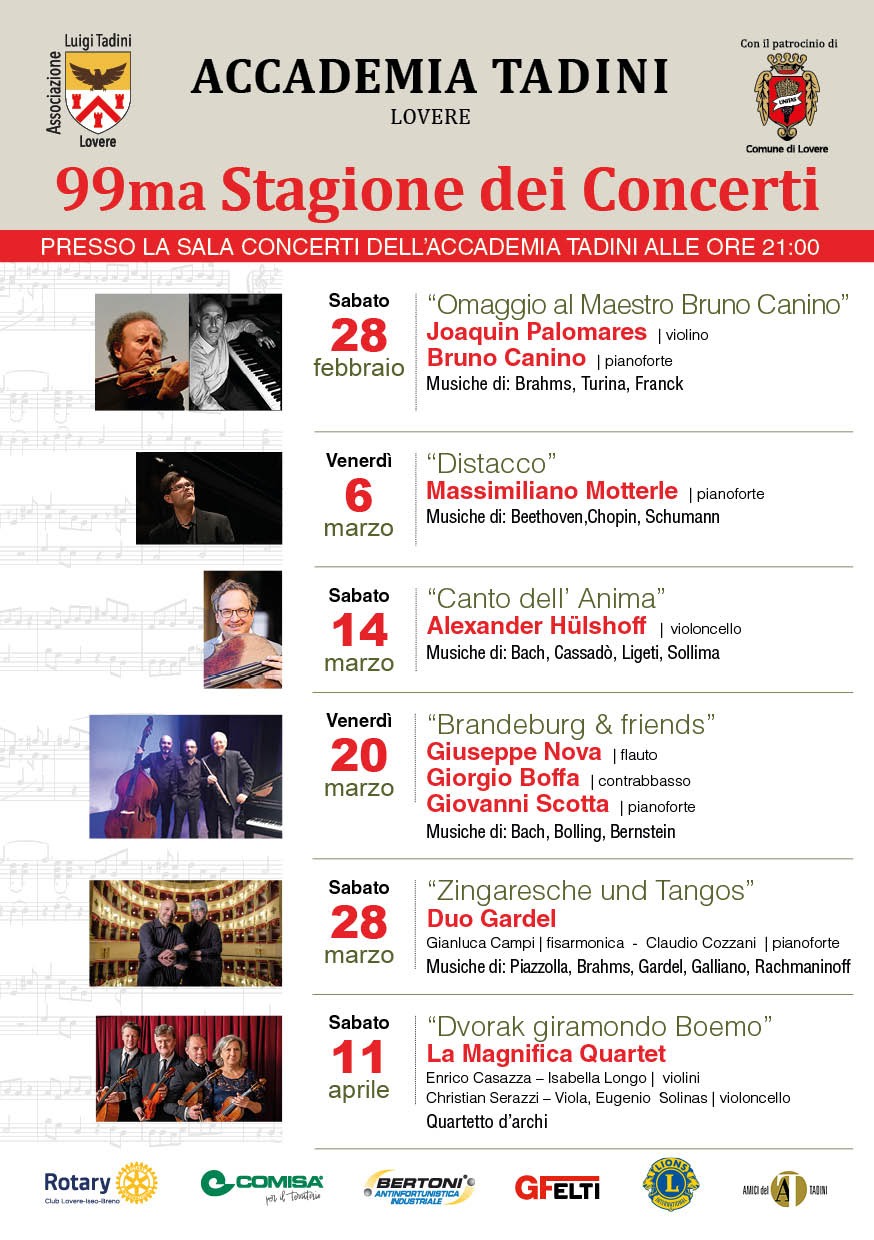 Giunta alla 99ma edizione, la Stagione dei Concerti dell’Accademia Tadini si caratterizza per un cartellone ricco e di grande raffinatezza che intende riproporre idealmente quel contesto di alto intrattenimento che si respirava nella Lovere ottocentesca, senza rinunciare alla consolidata volontà di proporre ogni anno un evento aperto ai nuovi linguaggi o ad altri stili musicali.