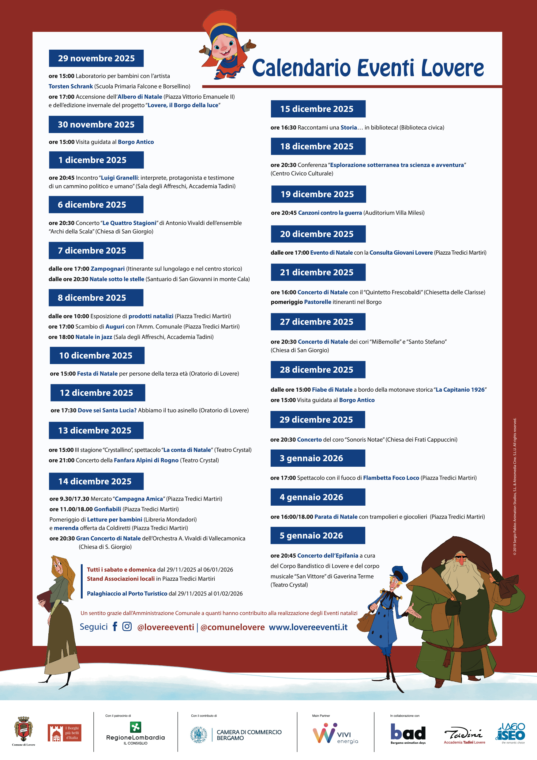 Nella locandina sotto allegata sono riportati tutti gli eventi che si svolgeranno a Lovere nel periodo natalizio e nei primi giorni del 2026.
