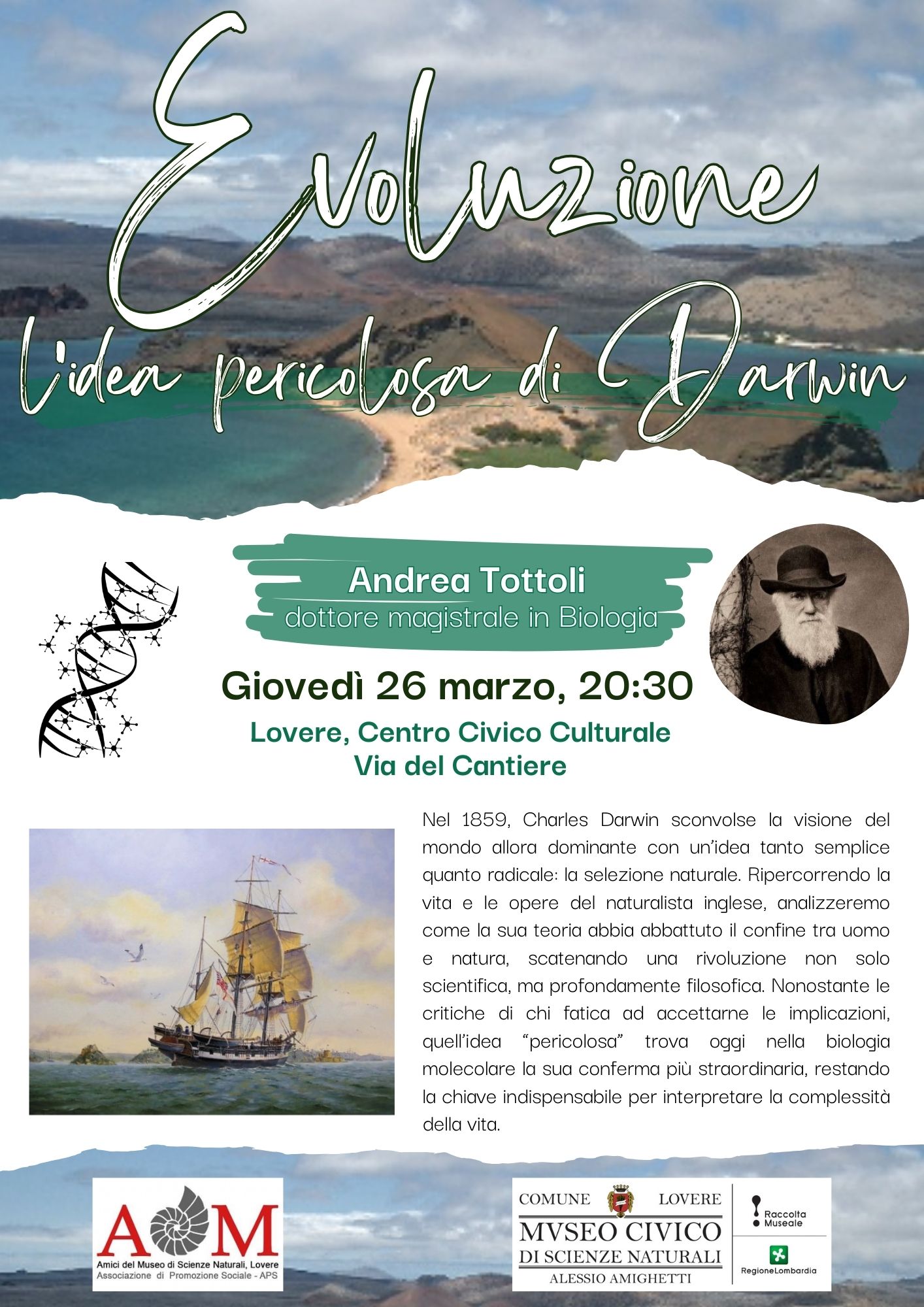 Giovedì 26 marzo 2026, alle ore 20:30 presso il Centro Civico Culturale in Via del Cantiere al Porto Turistico a Lovere, si terrà la conferenza a cura di Andrea Tottoli, dottore magistrale in Biologia, dal titolo “Evoluzione: l’idea pericolosa di Darwin”.