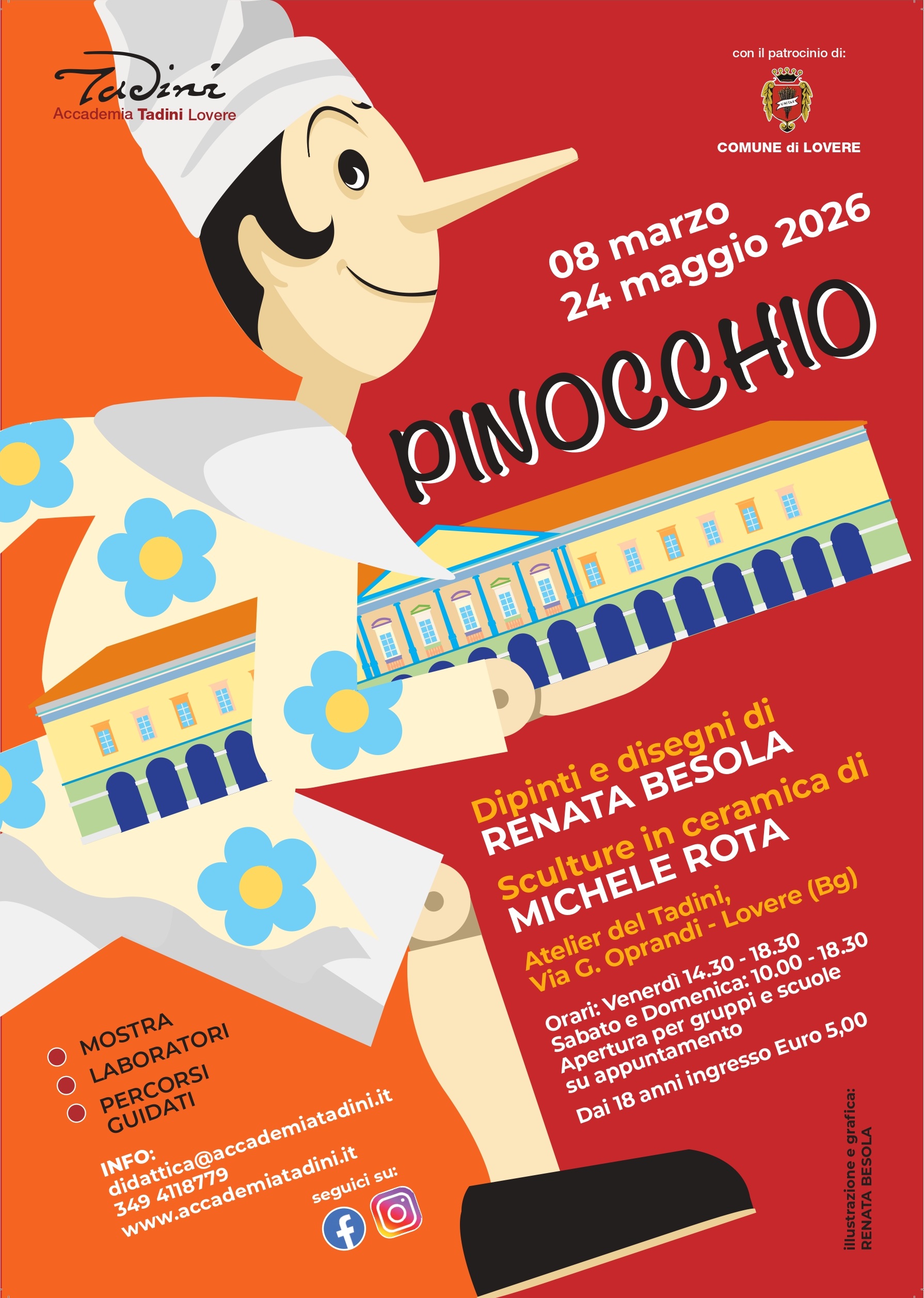 Domenica 8 marzo 2026 aprirà la mostra “Pinocchio”, allestita presso l’Atelier dell’Accademia Tadini a Lovere in occasione del secondo centenario della nascita del suo autore, Carlo Lorenzini (in arte Collodi). L’iniziativa intende riproporre una lettura delle avventure del suo personaggio più celebre concepito come un viaggio nella memoria attraverso le opere grafiche di Renata Besola e le sculture in ceramica di Michele Rota.