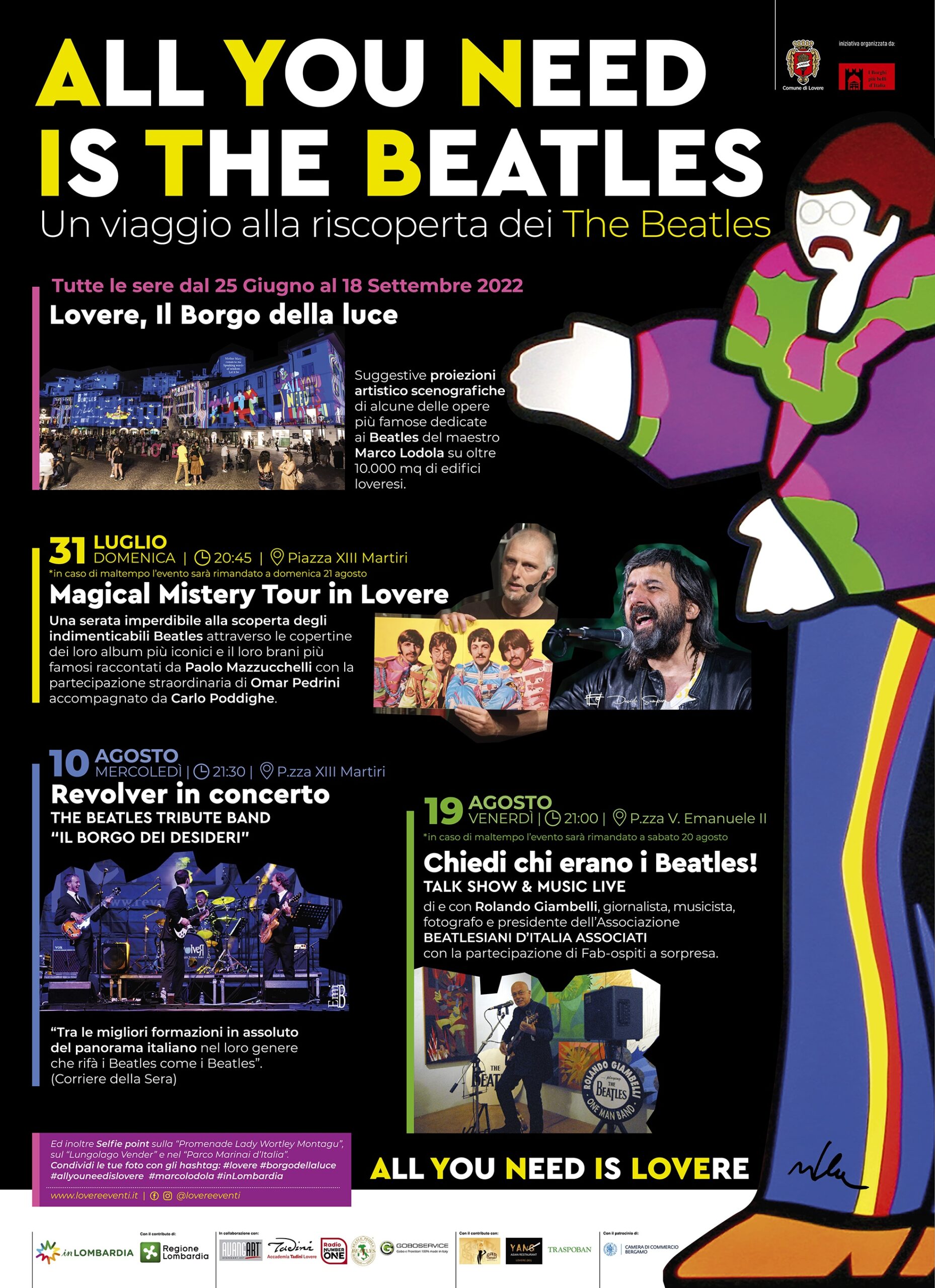 Continuano le manifestazioni per celebrare la leggenda del quartetto di Liverpool, i protagonisti dell’XI edizione del progetto “Lovere, il Borgo della luce – all you need is lovere”: domenica 31 luglio con Paolo Mazzucchelli tra dialogo e musica con Omar Pedrini accompagnato da Carlo Poddighe, mercoledì 10 agosto con il concerto della tribute band bergamasca “Revolver” e venerdì 19 agosto con talk show del presidente dell’Associazione Beatlesiani d’Italia Associati Rolando Giambelli.